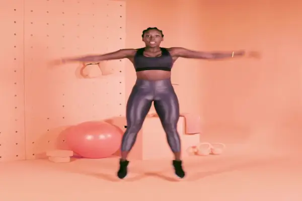 Sådan gør du: Stå med fødderne hofteafstand fra hinanden, med armene ved siden af. Løft derefter armene ud til siderne og over hovedet samtidig, og hop dine fødder ud, så de er lidt mere end skulderbredde fra hinanden. Vend hurtigt bevægelsen uden at holde pause. Det er en rep.