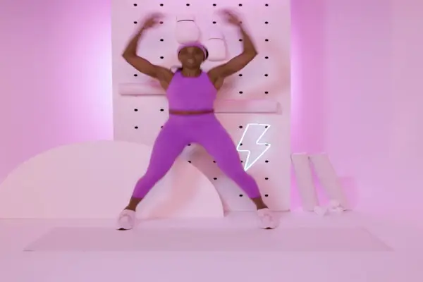 - Hop begge fødder ud bredere end hofternes afstand og sving samtidig forlængede arme ud til siderne og op over hovedet.